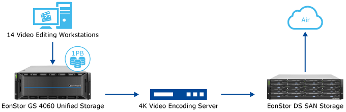 Všechna videa, která jsou již upravena nebo procházejí úpravami, jsou uložena v GS 4060. Když jsou videa připravena k vysílání, jsou odeslána na kódovací server. Po zakódování budou uloženy v Infortrend’s EonStor DS, připraveny k vysílání.