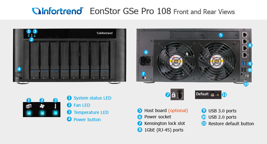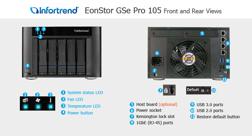 EonStor GSe Pro 100は、デスクトップストレージシリーズの入門機で、業務をサポートする企業向けの基本的な機能を備え、限られたオフィス空間に対応しています。USB 2.0、USB 3.0、1GbE、12Gb/s SASと接続オプションも豊富です。