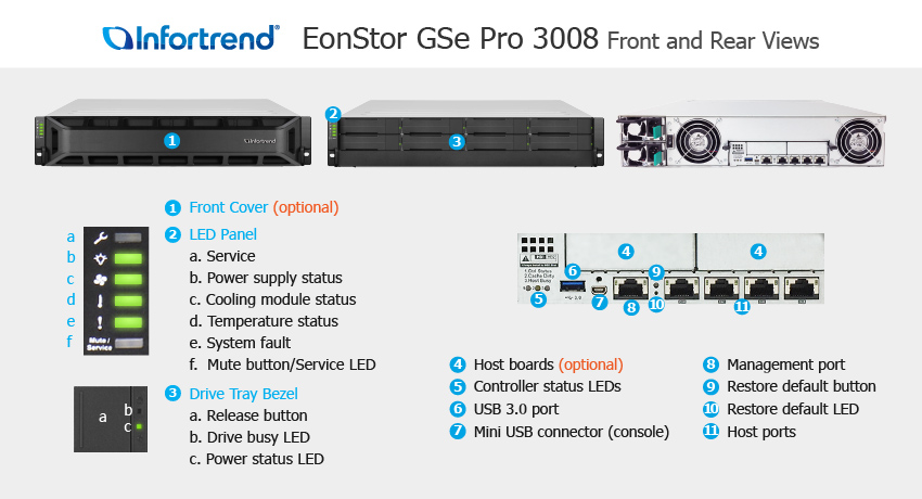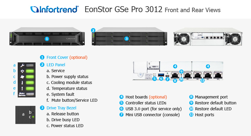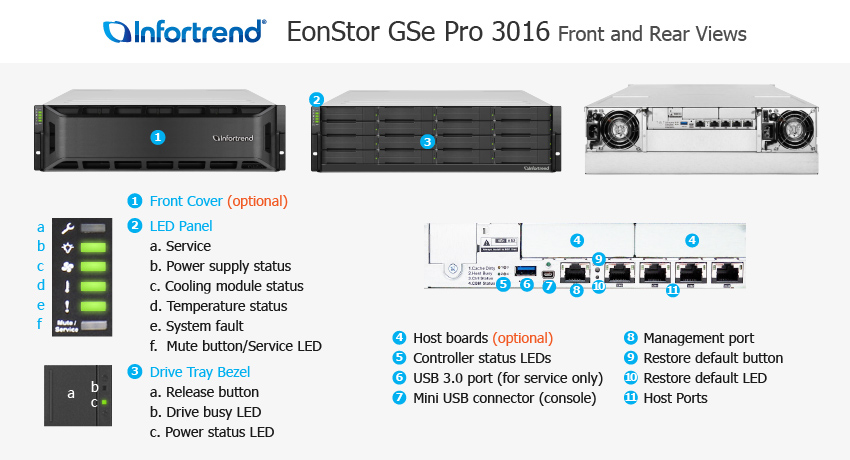 EonStor GSe Pro 3000は、中小企業向けユニファイドストレージで、手間のかからない管理、クラウド統合と将来のデータ増加に備えて、最大16PBまで性能と容量を直線的に拡張可能なスケールアウト機能を備えています。また、モジュラーホストボードのスロットが2つあり、柔軟な設置が可能です。